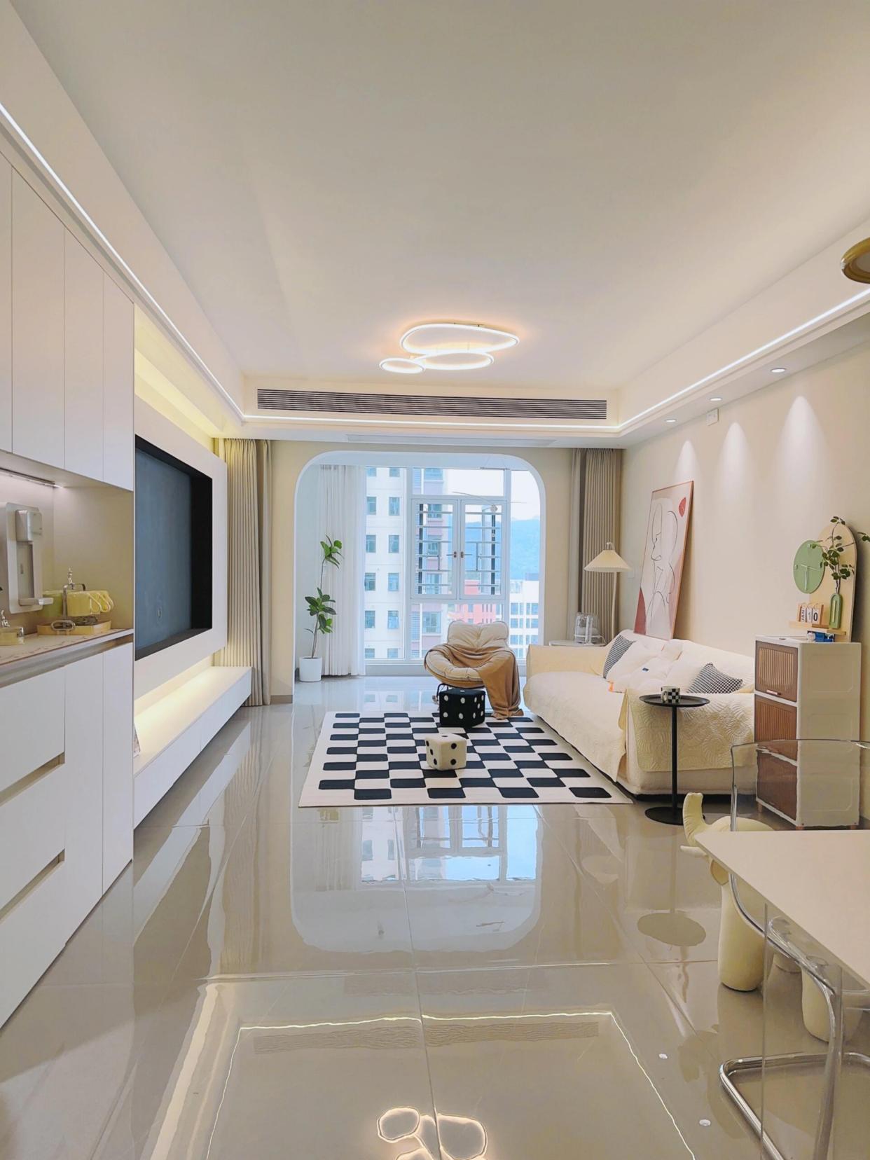 中间户的采光弊端完全能改善,把客厅和阳台打通,让阳光洒满屋。