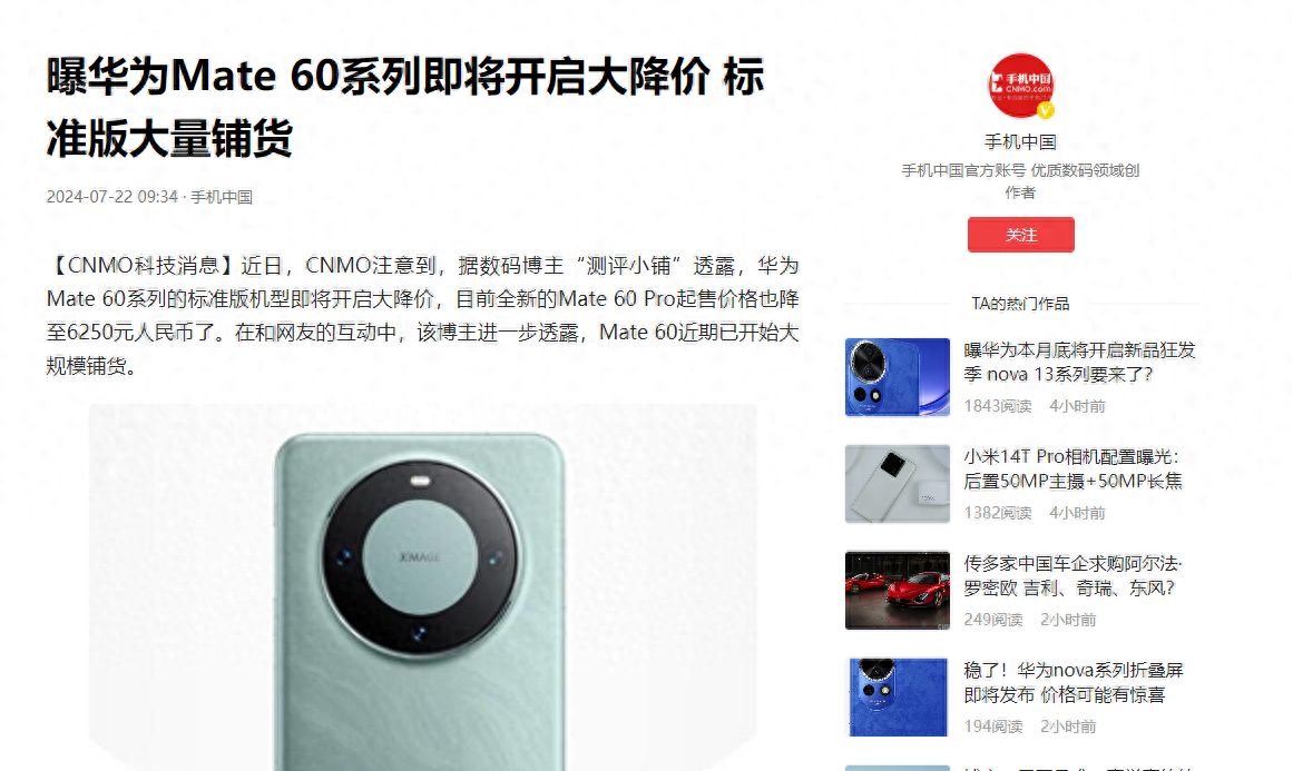 在科技的广袤天地中,华为始终如一颗璀璨的明星,吸引着无数目光。近期,华为 Mate 60 系列标准版机型降价与大规模铺货的消息,犹如一颗石子投入数码之湖,激起层层涟漪。