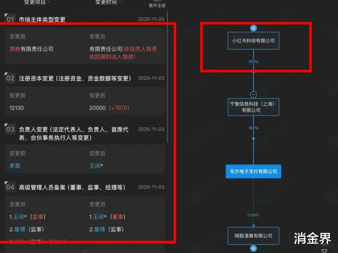 一家连年亏损的支付机构在监管续展前夕悄然易主并增资,其新东家正是估值超2000亿元的社交平台小红书。企查查11月3日信息显示,东方电子支付有限公司完成了一系列关键变更:法人代表由茅蔚变更为王闰,注册资本由1.213亿元大幅增至2亿元,公司性质也变为有限责任公司(非自然人投资或者控股的法人独资企业)。