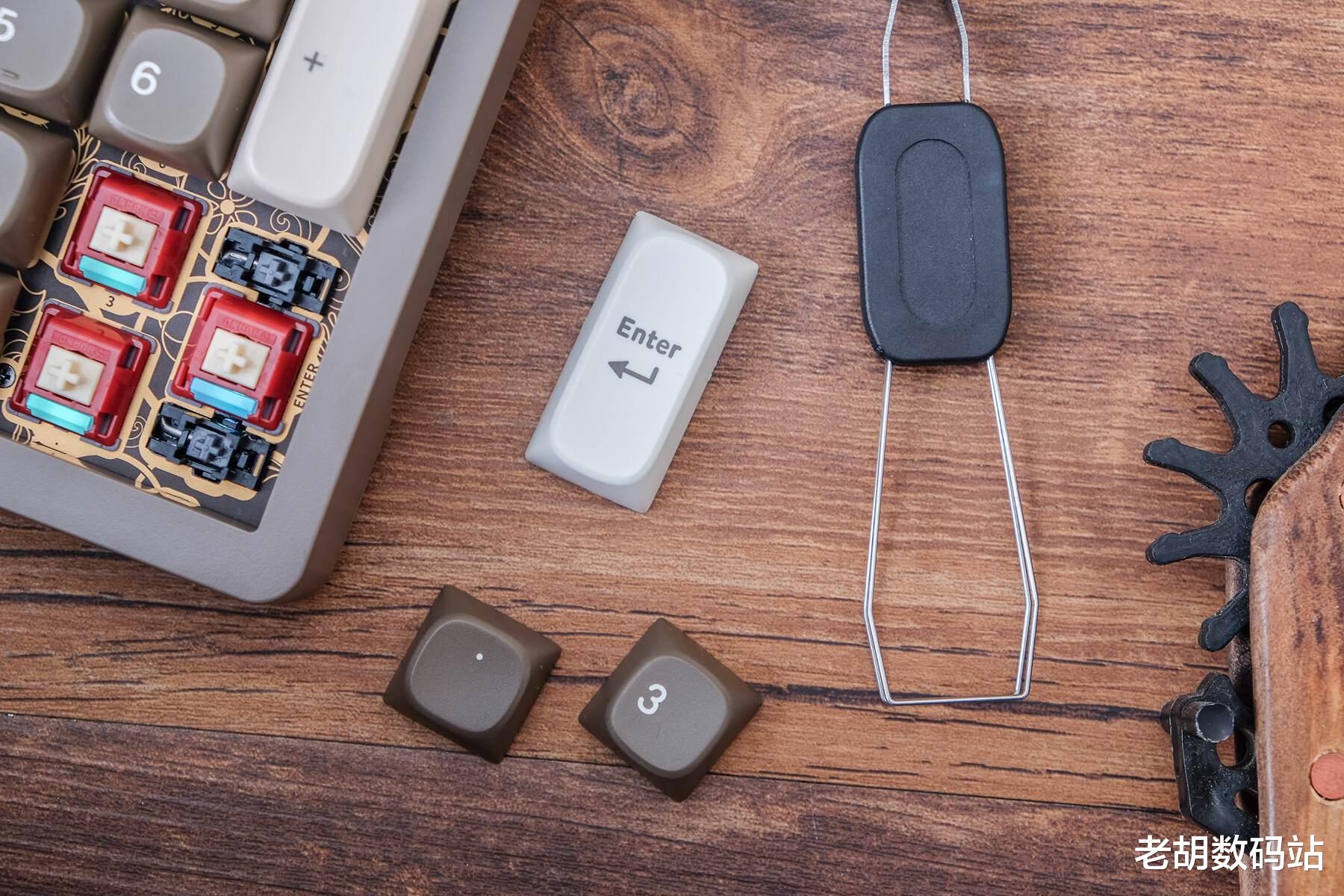 轴体方面,用的是和环诺定制的黑曜轴和瑰夏拿铁轴。我手上这把“漪”配色配的是瑰夏拿铁轴,是一种很顺的线性轴,出厂就润滑过了。用它打字,能明显感觉触底和回弹的声音手感都很有层次,敲击音很带感,而且长时间用也不累手,不管是办公还是打游戏都很舒服。