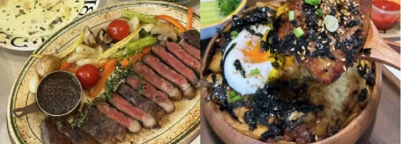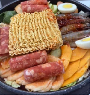 分量超足,大虾、泡面、鱼饼、肥牛,香菇、鸡蛋. 汤底是浓郁的韩式辣酱味,煮到泡面吸满汤汁,配着虾的鲜甜,一口下去超满足!石锅拌饭胡萝卜丝、豆芽、菠菜煎蛋,加上秘制辣酱拌匀,每一口都有不同的口感,米饭裹着酱汁特别香!