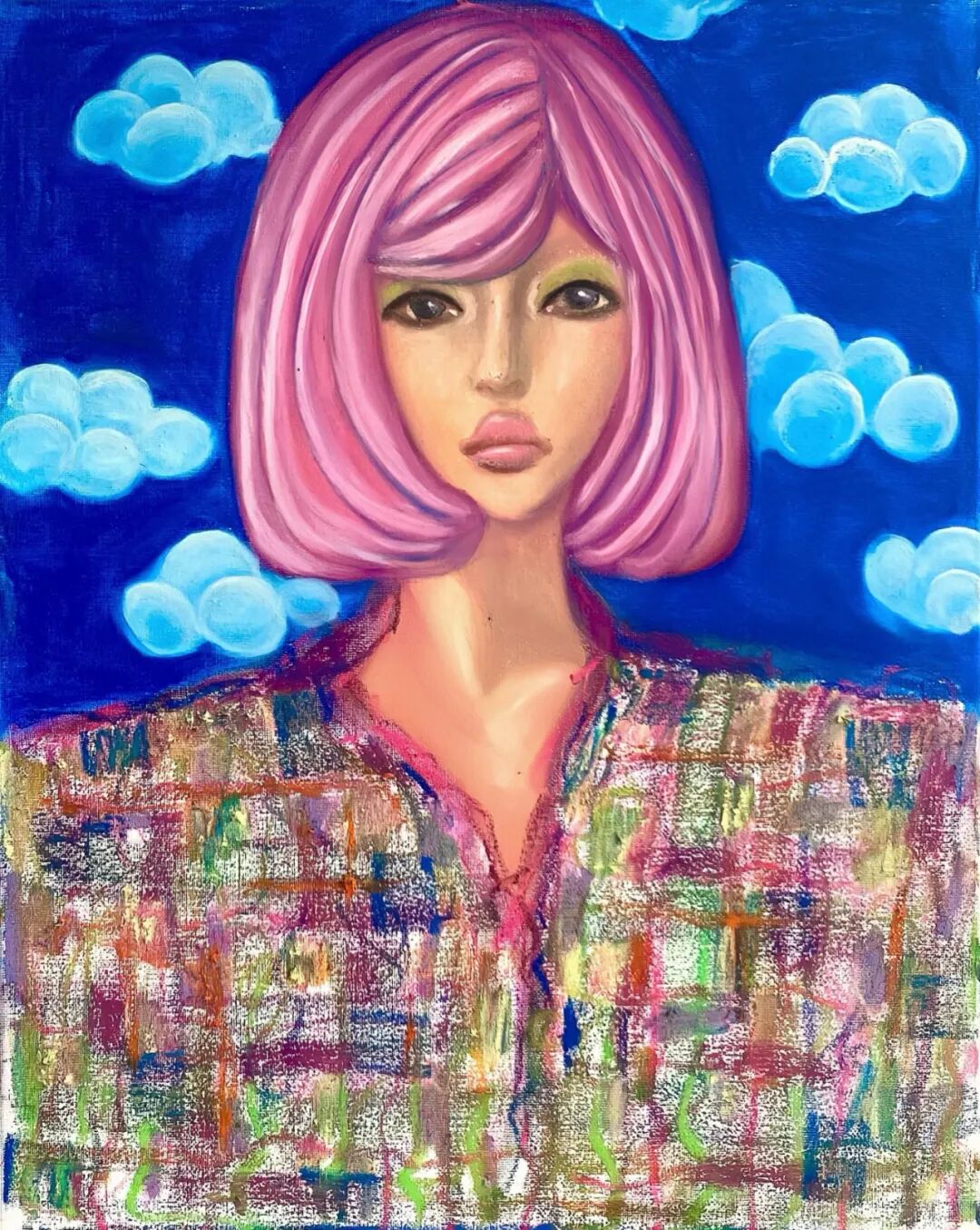 程菲菲 《戴粉色假发的女孩》 油画棒 40×50cm 2025