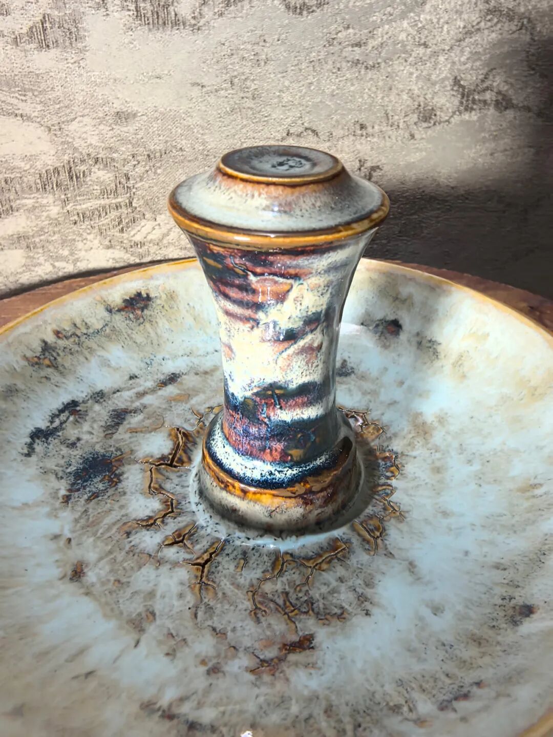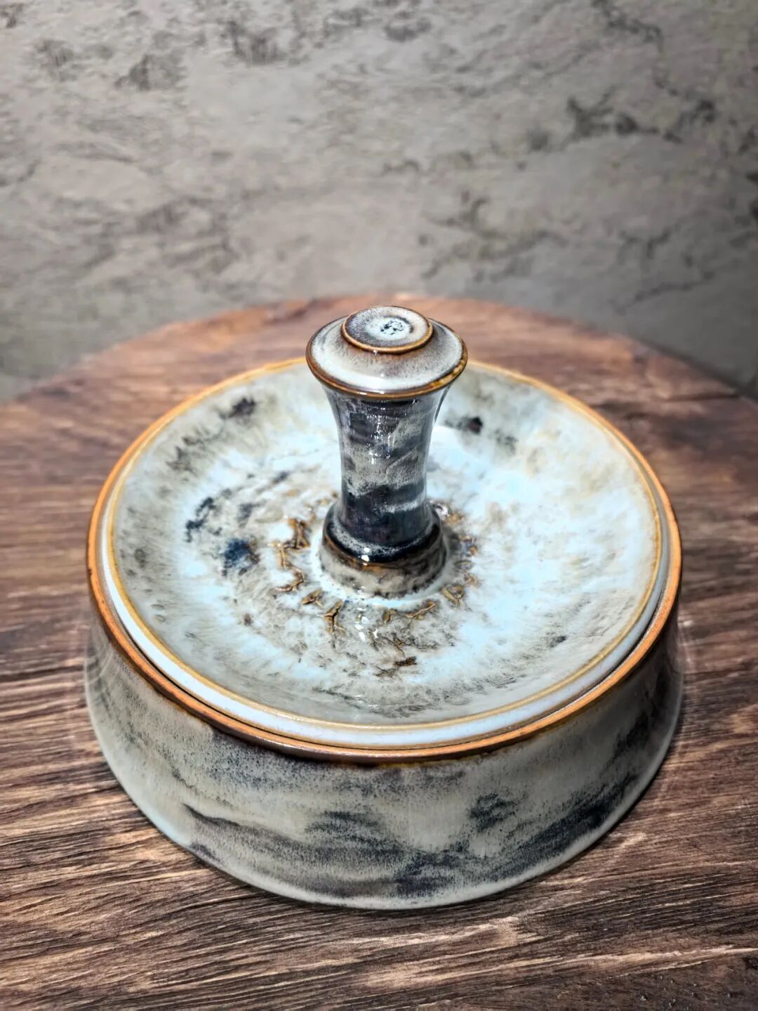张琪,师从浙江龙泉青瓷大师邵建军先生,从事青瓷制作近10年,现为兰州新区松染制器文化创意工作室负责人,三级陶瓷设计师。主研本地原料融合传统青瓷烧制技法工艺创新,近年成功制作《星环》、《无极》等作品。作品简介:“尘光”将“相生”主题寓于形釉之间。灰白黑釉色交融如天地初分,灰似薄雾叆逮,白若雪霰初凝,黑如玄岩浸月,恰似阴阳流转的浑然秩序。圆润罐身承托挺拔盖顶,一柔一刚、一静一动;瓷胎密闭护持茶香,釉面温润光泽映照时光,尽展哲思与茶艺的共生共鸣。