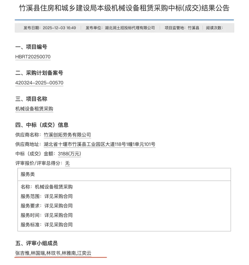 这5个人爆火的原因,最早可以追溯到12月3日湖北省竹溪县住建局公示的一份“机械设备采购租赁中标公告”,这5个名字以“评审专家”的身份位列其中。