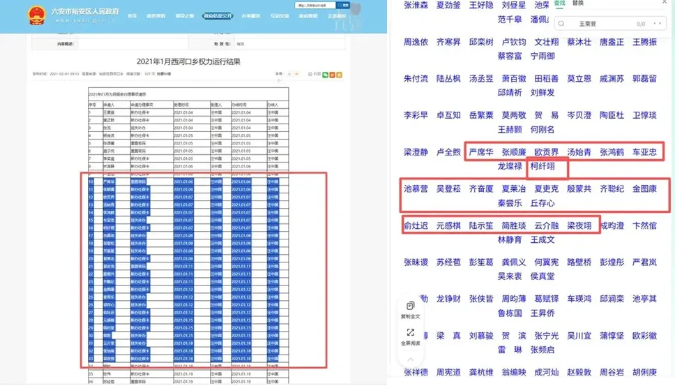 类似的还有新近爆出的安徽省六安市裕安区人民政府官网政务公开栏目公布的2021年1月西河口乡权力运行结果中的《2021年01月为民服务办理事项清册》,这份名单中,序号10至33的姓名列表与百度文库里“姓名大全2”中的某一段姓名完全对应,仅个别名字存在一字之差的修改痕迹。