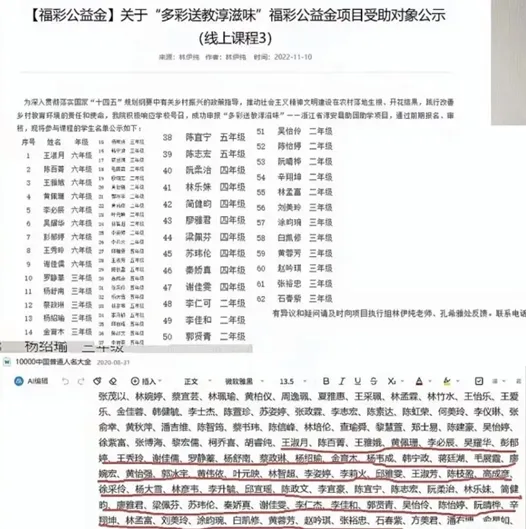 2这起“全民造假”最让人细思恐极的,是12月5日媒体的爆料,称杭州师范大学人文学院一项福彩公益金项目的受助对象公示名单中,也出现了那份《10000中国普通人名大全》中的名字。虽说这回终于不是“张吉惟等5人”了,但这个名单里公示的60多位“受助对象”的名字也全部都可以在《10000中国普通人名大全》里找到,并且排列顺序同样如出一辙。