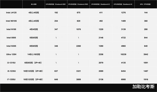 我已经把所有主流NAS处理器的性能都汇总了,可以看到Ultra125H遥遥领先。就拿英特尔8505处理器相比,单核性能强5%,多核性能是2.16倍,显卡性能更是4.67倍。