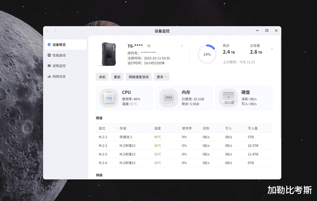 第一点,确定无疑,消费级最强的全闪存NAS来了!极空间T6原生支持6个NVMe SSD的盘位设计,采用英特尔Ultra 125H处理器(14核心18线程),还拥有万兆网口 + 双雷电4接口 + 内置UPS + 内置WiFi6 + CFe/SD卡接口,还拥有一个5.99英寸控制屏。这配置,已经不是NAS,而是高性能数据工作站的规格!