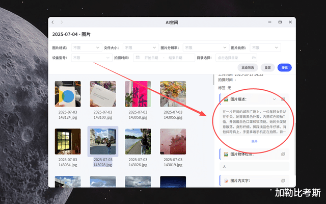 关于照片这块,AI是把每个照片内容都分析出来,用了一段话来描述,从而让咱们更好的筛选。而且它还包括有图片内的物体与人物检测,并标注出来。