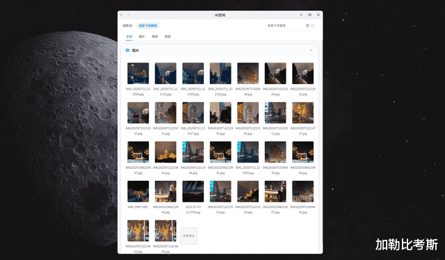 AI空间是可以识别具体场景、具体的人的,比如我说“夜景下的建筑”,可以看到立马从数千张照片里面寻找到对应的图片,而且响应速度非常快,立马就出来了。