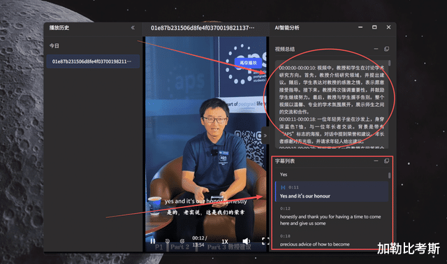 可以看到我打开一个全英文的采访视频,它不光会自动生成字幕,还翻译出来了,还给了视频内容总结!注意:翻译内容在总结里面,可以打开查看。
