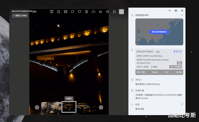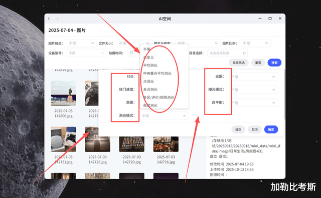 AI空间还支持基于EXIF信息的维度搜索,可以看到一张照片所有拍摄信息都会被抓取,包括ISO、快门速度、焦距、测光模式、光圈、曝光模式、白平衡等等。咱们直接可以根据参数来筛选。