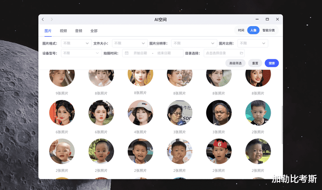 它还能以图搜图,还能用人脸找到这个人所有的图片,也能根据时间维度、人像维度来进行自动分类,当然还能按照自己的想法想怎么来就怎么来分类,把所有搜索出来的照片再保存一个文件夹都行。
