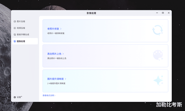 2、它支持AI影像处理,比如视频的智能字幕生成、图片/视频的压缩、黑白照片上色、老照片修复、图片提升清晰度等,都是刚需的好功能啊。
