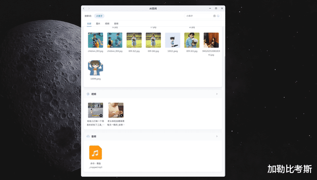 这个AI空间支持对图片、视频和音频文件的检索,只要图片、视频、音频中出现的画面与文字,它都能检索到,比如我搜索小孩子,它可以从图片、视频以及音频里面都找到有关于小孩的信息。