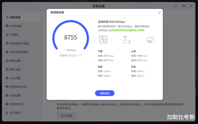 通过万兆交换机连接电脑,进行网口测试,可以看到连接速度达到8755Mbps,换算下来就是1094MB/s的速度,这个万兆速率已经拉满了!