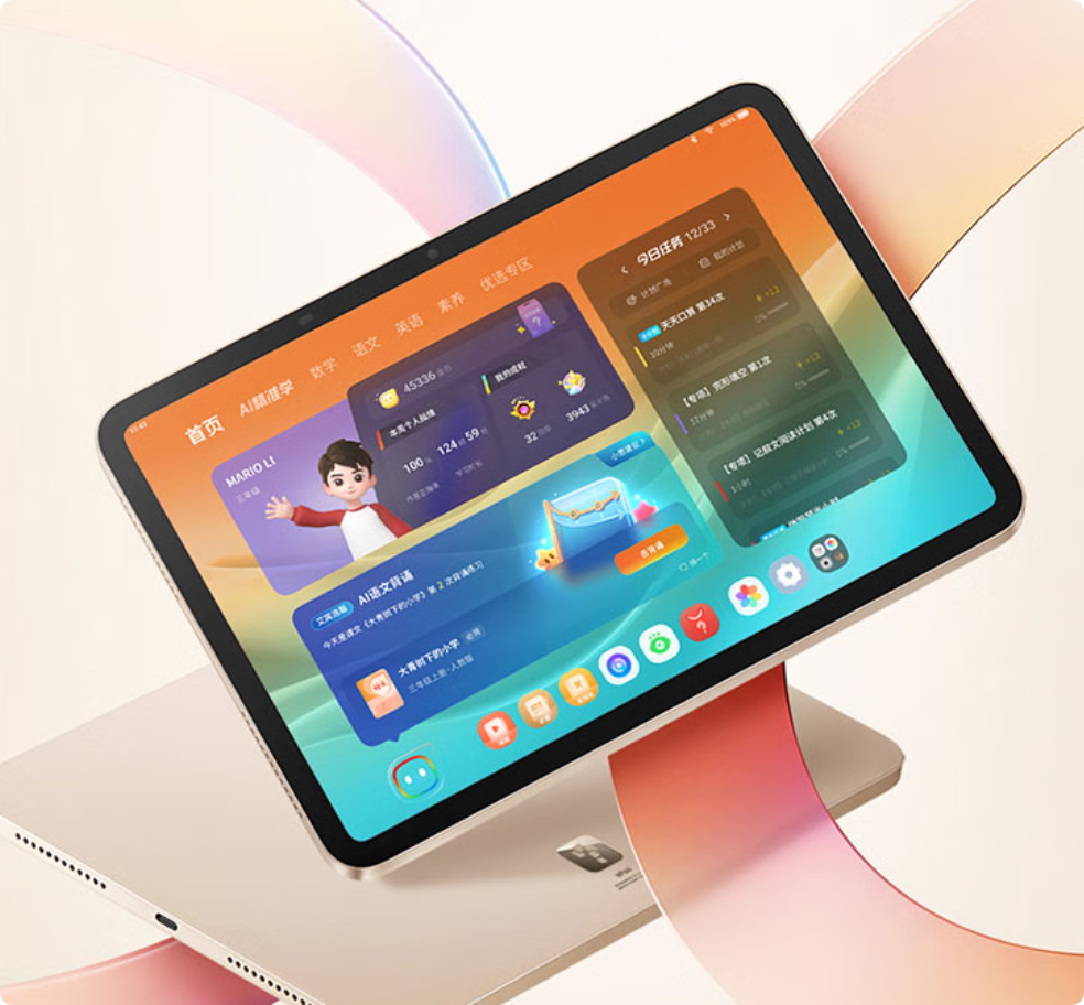 产品创新:融合AI智能辅导与硬核护眼技术,打通早教到高中的学习闭环,实现一机多用。