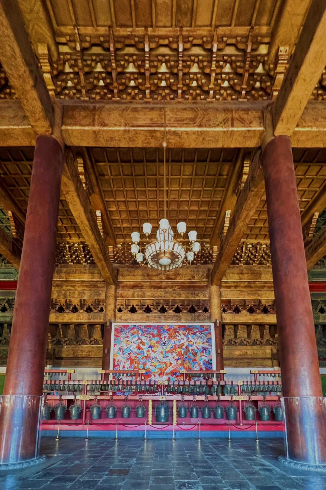 当真正步入享殿,一种震撼之感油然而生。殿内的 68 根金丝楠木大柱子,粗壮笔直,直插云霄。金丝楠木特有的纹理在光影的交织下若隐若现,仿佛流淌着岁月的痕迹,散发着淡淡的木质清香,萦绕在鼻尖,让人心神宁静。这些珍贵的木材,在当年不知耗费了多少人力物力才汇聚于此,成为了这座宫殿独一无二的标志。殿顶的天花、梁架皆用片金沥粉彩画装饰,龙凤之姿、云纹花卉,色彩鲜艳而不失庄重,笔触细腻而富有神韵,每一处彩绘都宛如艺术珍品,展现着古代宫廷艺术的巅峰之作。地面所铺的金砖,平整光滑,色泽温润,历经岁月磨砺依然坚实如初,与整个殿堂的氛围相得益彰,更增添了一份奢华与尊贵之感。
