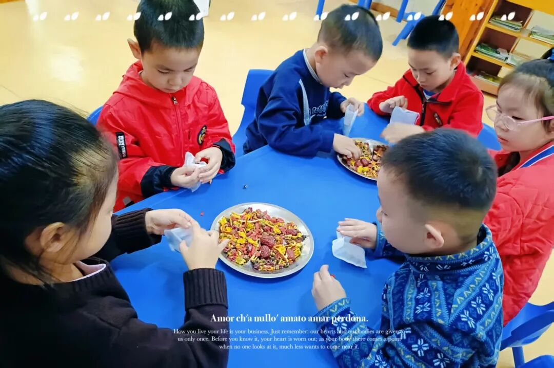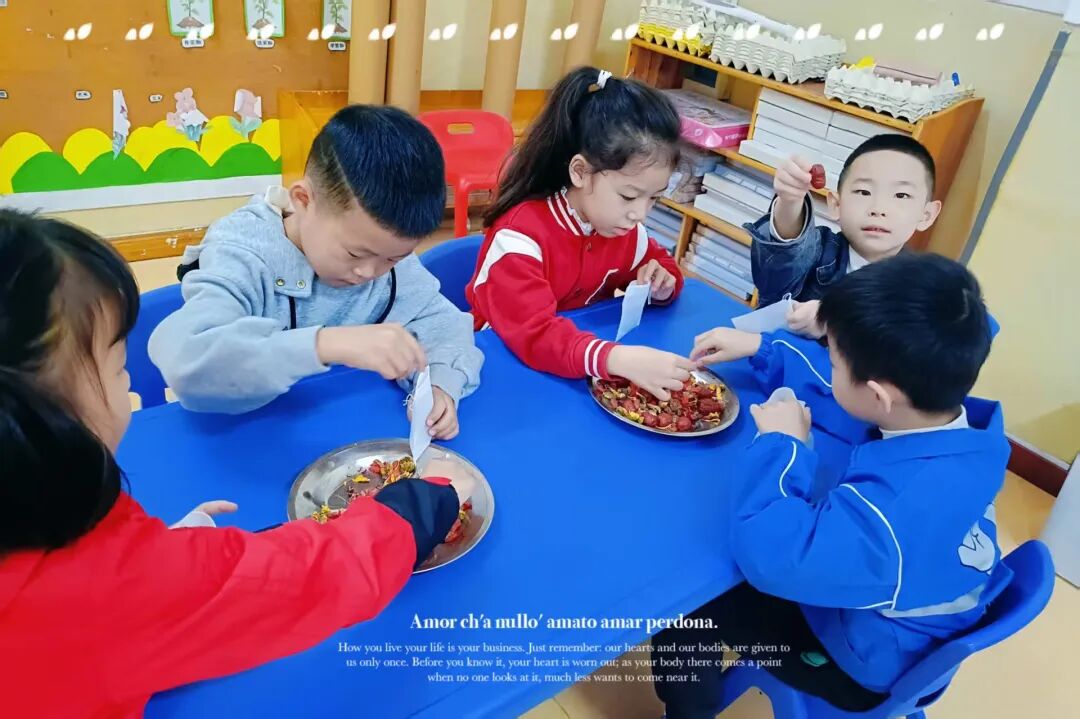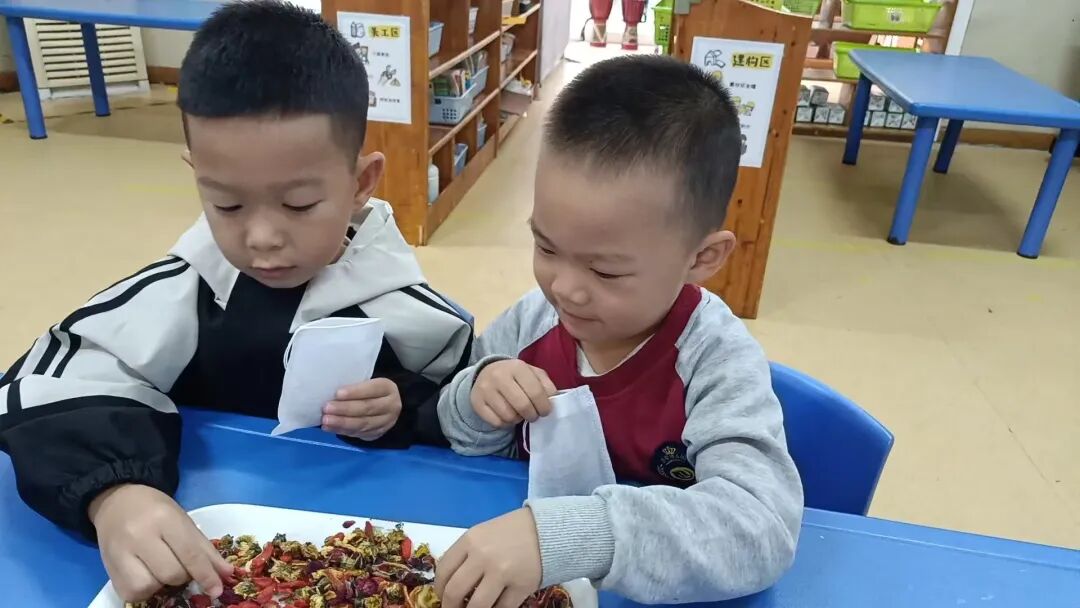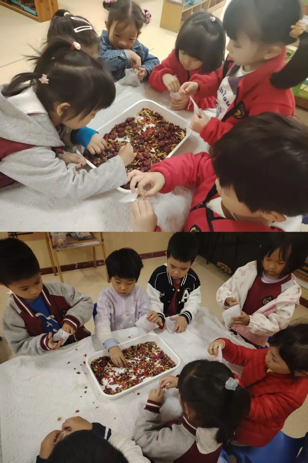 紧接着,老师们像变魔术一般,展示了为制作暖茶准备的各式食材:清热的菊花、芳香的玫瑰、红艳的枸杞、甘甜的红枣、清香的橙皮……孩子们睁大了好奇的眼睛,认识这些秋冬时节的养生宝贝,并牢牢记住了老师的重要提醒:这份充满心意的暖茶是献给长辈的专属礼物,小朋友们因为正在长身体,是不适宜饮用的哦!
