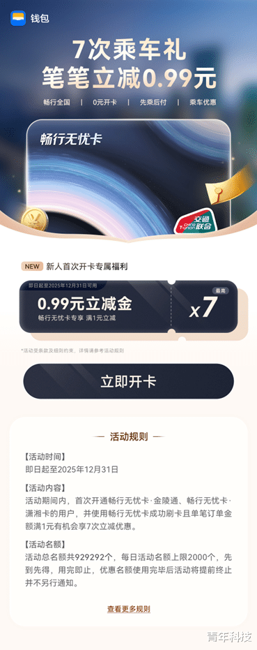 既然是新卡上线,福利自然少不了,羊毛必须薅到位!即日起至12月31日,首次开通畅行无忧卡·潇湘卡的用户,不仅能享受长沙本地的乘车优惠政策,还能叠加享受最高7次单笔立减0.99元的全国乘车福利,相当于白嫖好几趟车费。