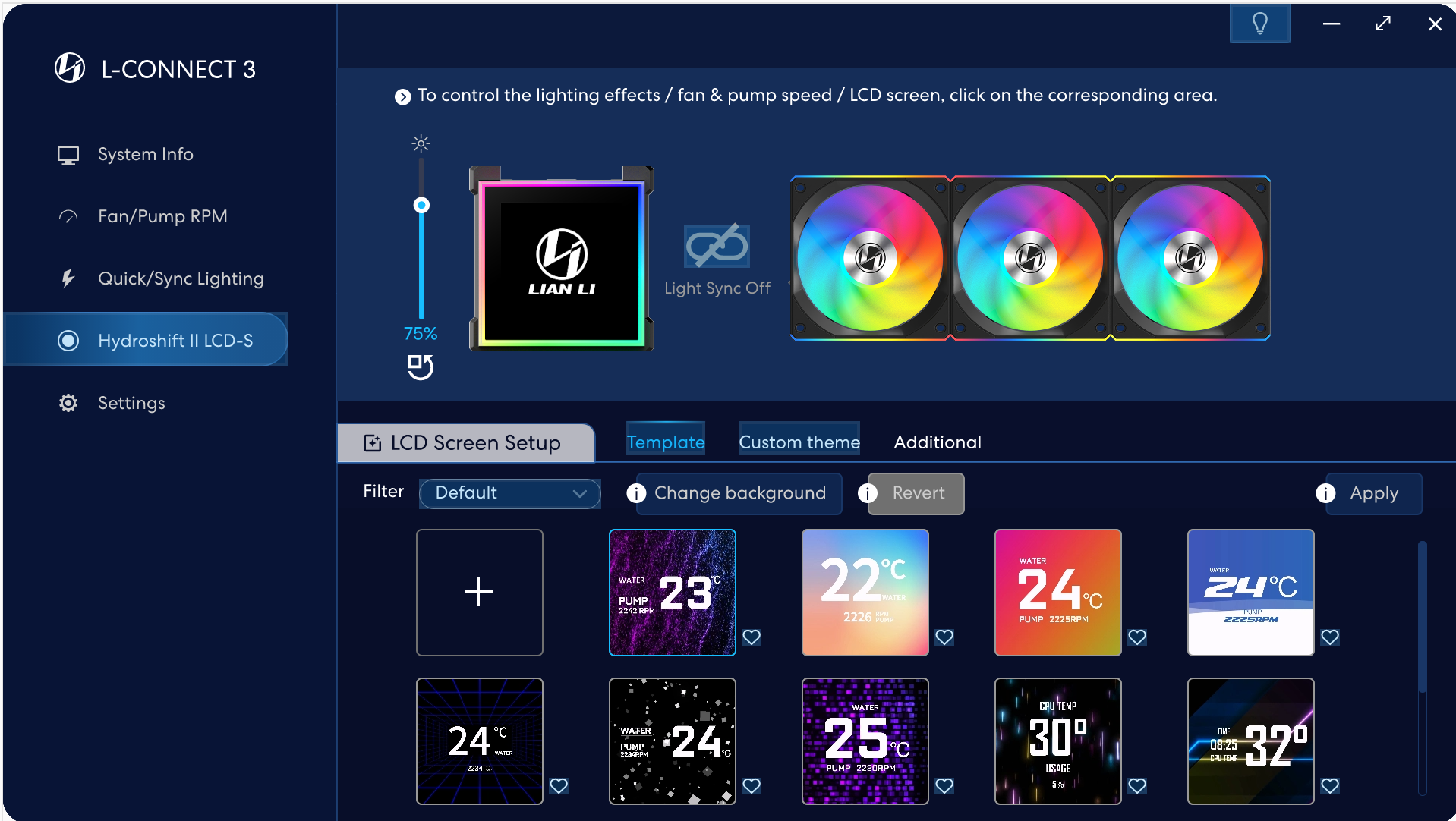 通过 L-Connect 3 软件,用户可实现全方位的个性化设置。13 种预设背景搭配自定义主题功能,能轻松打造专属屏幕显示效果。灯光同步功能支持与联力其他无线产品联动,营造统一的整机光效。