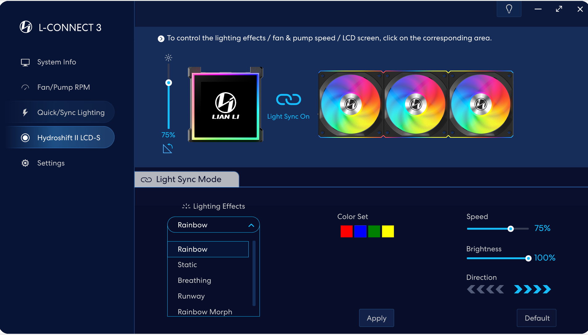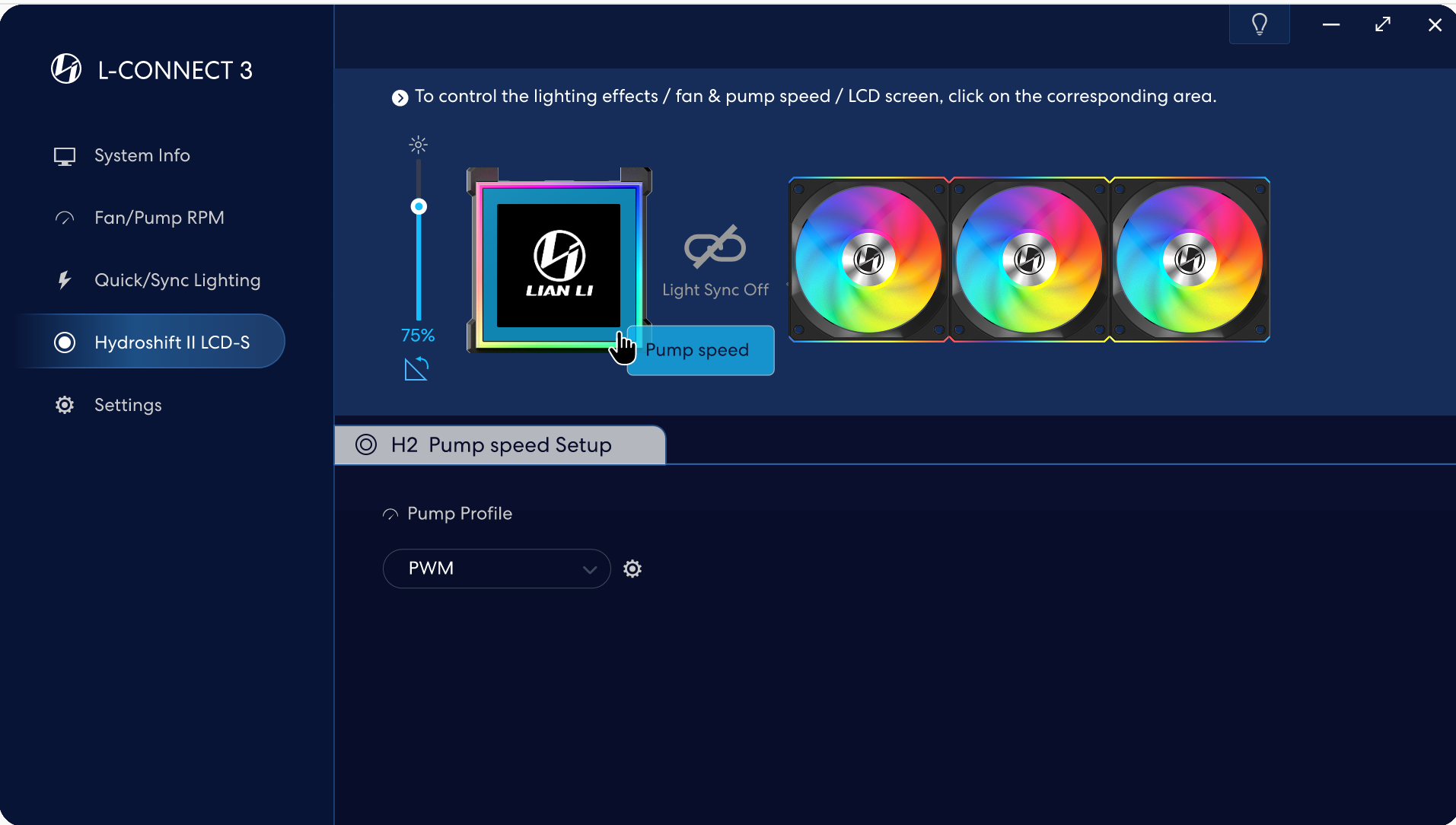 屏幕进阶设置可在无线模式下使用,其操作方式与TL LCD Wireless和SL LCD Wireless UNI FAN系列风扇相同。要控制这些设备的LCD屏幕,需同时使用L-Wireless Sync控制器和连接主板的USB线缆。在屏幕进阶模式下,屏幕背光、水泵转速、风扇灯光及转速仍通过无线控制。但由于已连接USB线缆,用户现可通过L-Wireless工具页面对LCD屏幕进行完全自定义设置。