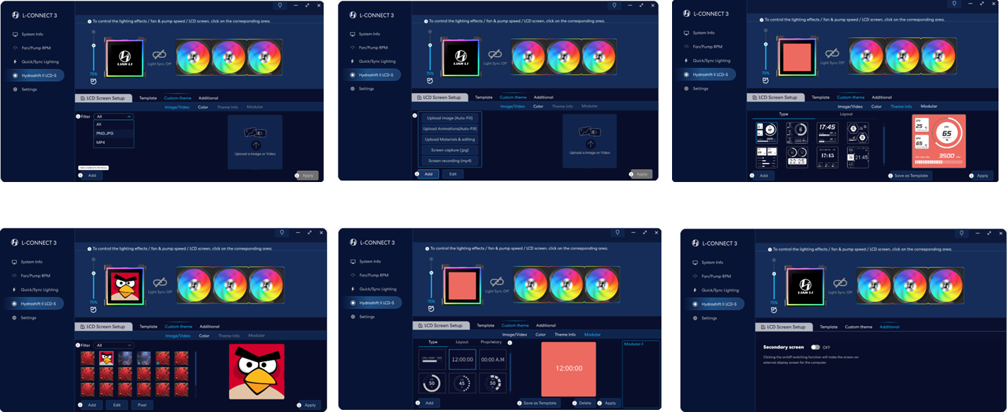 更实用的是三种控制模式全覆盖:离线模式无需软件,直接显示水冷液温度、泵转速等核心信息,降低 CPU 占用;无线模式通过 2.4GHz 传输,支持灯光同步和多硬件传感器数据监控,TL 版本还附赠 L-Wireless Sync 控制器;USB 连接模式则解锁深度自定义,可上传图片、视频、GIF 作为背景,甚至能变身电脑副屏,玩法极具扩展性。