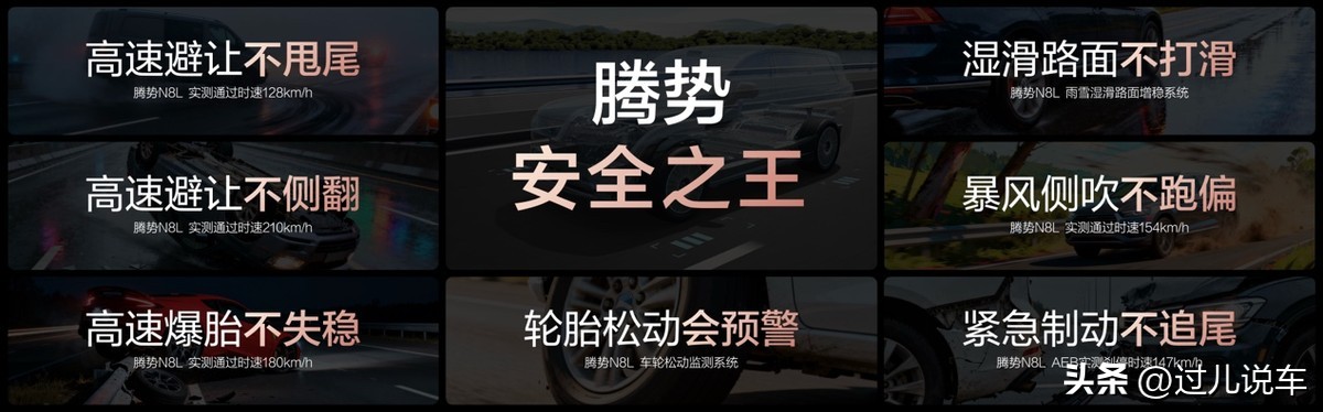 主动安全方面,得益于易三方,腾势N8L能够以128km/h高速避让不甩尾、210km/h高速避让(鱼钩测试)不侧翻、180km/h高速爆胎不失稳、154km/h暴风侧吹不跑偏、147km/h AEB自动紧急制动、不怕雨雪路面打滑、车轮松动监测系统,以科技安全守护家人出行安心。腾势汽车不愧被称为新能源汽车的“安全之王”。