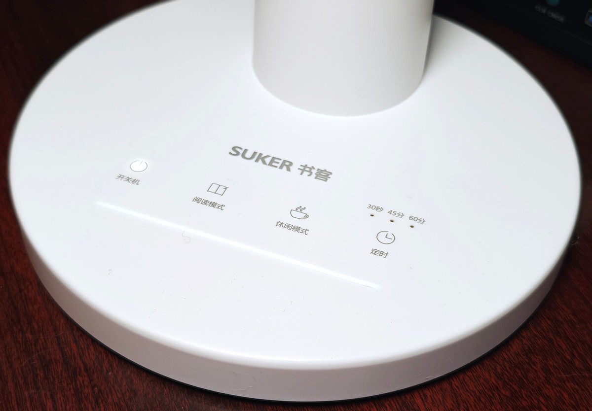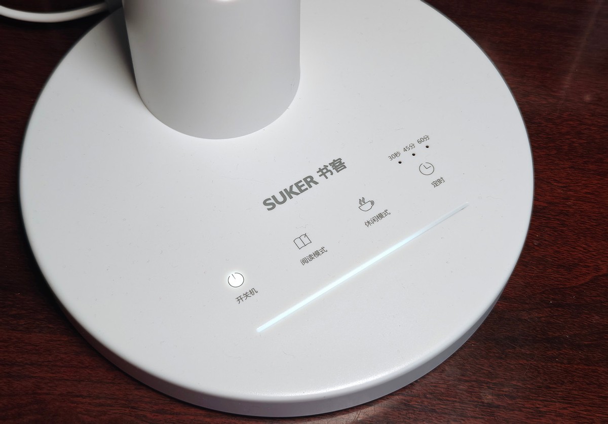 圆形的底座上,从左到右有四个按键,分别是开关机、阅读模式、休闲模式和定时,底下的长条则是调节灯光亮度的。
