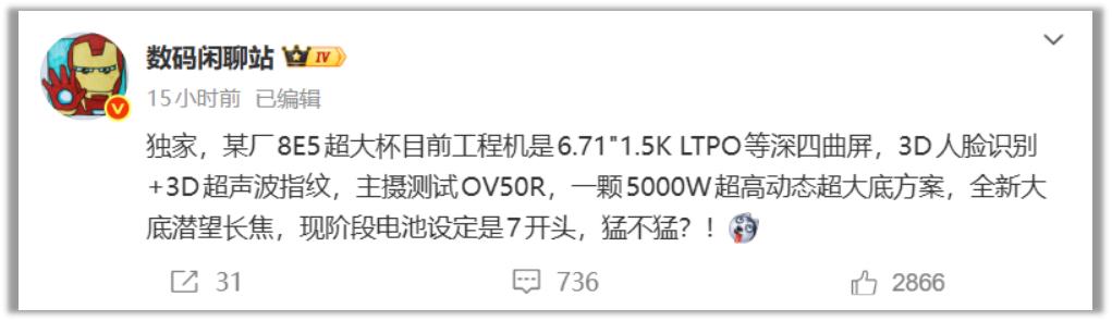 博主数码闲聊站最新消息:“独家,某厂8E5超大杯目前工程机是6.71"1.5K LTPO等深四曲屏,3D人脸识别+3D超声波指纹,主摄测试OV50R,一颗5000W超高动态超大底方案,全新大底潜望长焦,现阶段电池设定是7开头,猛不猛?!”