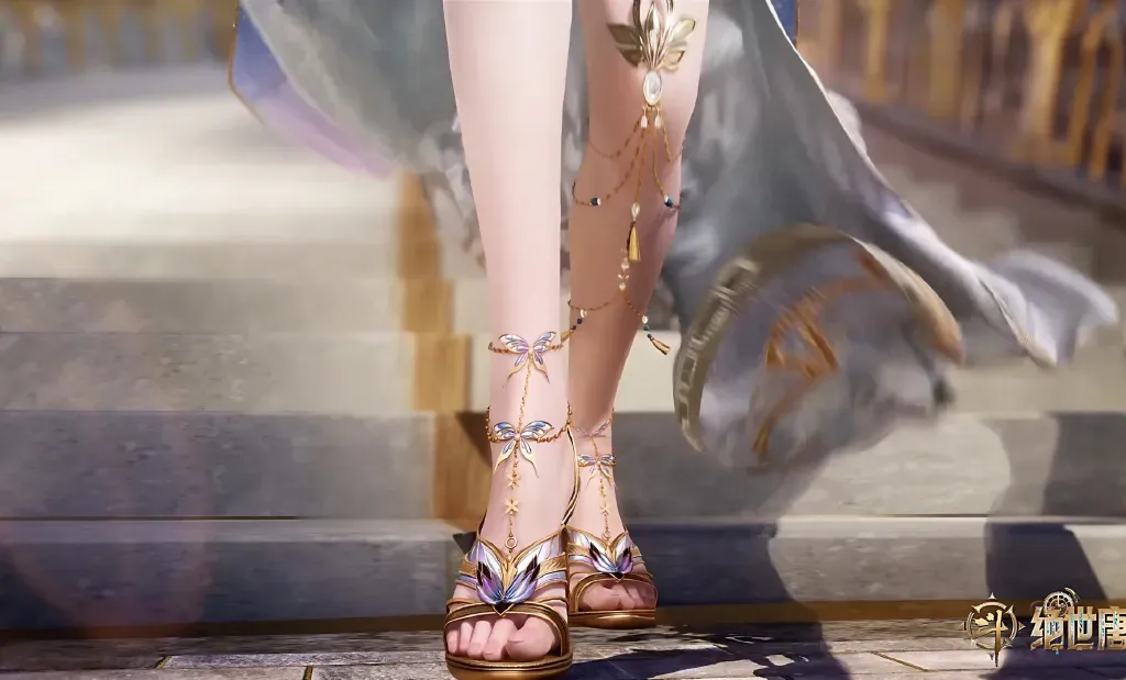 一侧则是高开叉设计,露出修长白皙的美腿。搭配黄金翡翠腿环和蝴蝶高跟鞋,无论是在室内还是室外,都可以说是美不胜收。裙摆这里是轻纱透明的,底部有一些金色绣花,和鞋子的颜色配套。要是一侧的高开叉能调低一点,就堪称完美了。