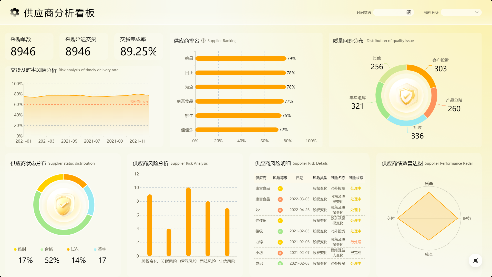 核心价值:它清晰地揭示了供应商提供产品的质量稳定程度。合格率持续偏低,预示着生产中断风险增高,并会引发内部质量部门的频繁投诉。