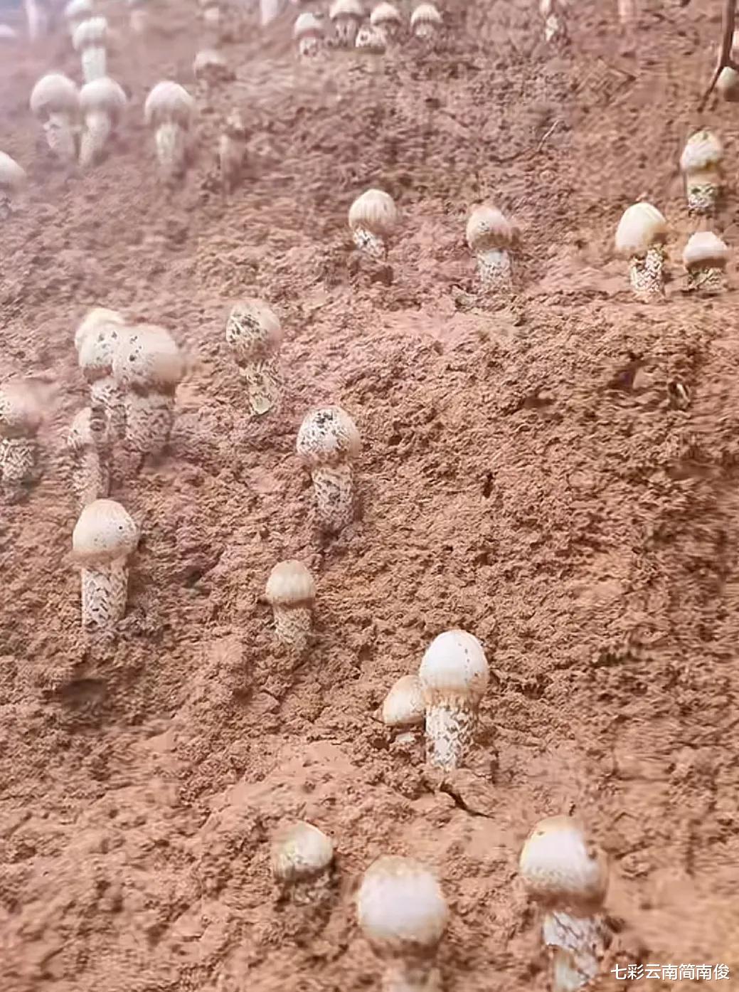 现场拍摄画面,一朵朵鸡枞菌破土而出,呈现骨朵状。鸡枞菌与黄土辉映成趣,构成一幅精美的山水田园图,令人眼前一亮,耳目一新。