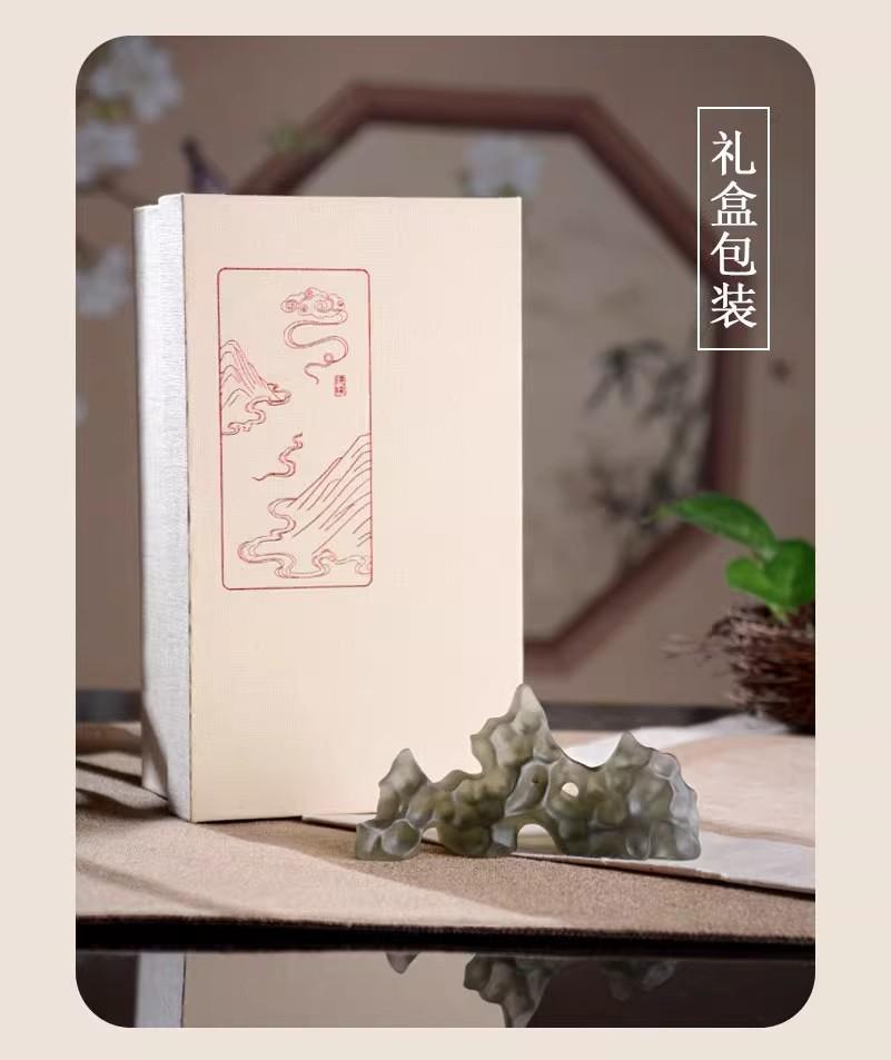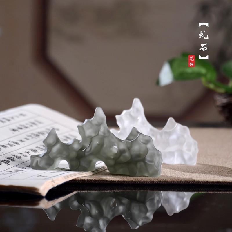 而虬石笔搁,则有着更为独特的造型。它不同于常见的规整山形笔架,更像是大自然中一块饱经岁月雕琢的奇石,其形态蜿蜒曲折,似有虬龙盘绕其中,线条流畅而富有动感 。那起伏的轮廓,或高或低,或凸或凹,每一处转折都仿佛在诉说着古老的故事。当毛笔搁置其上,宛如栖息于奇山怪石之间,为文房增添了几分灵动与野趣 。