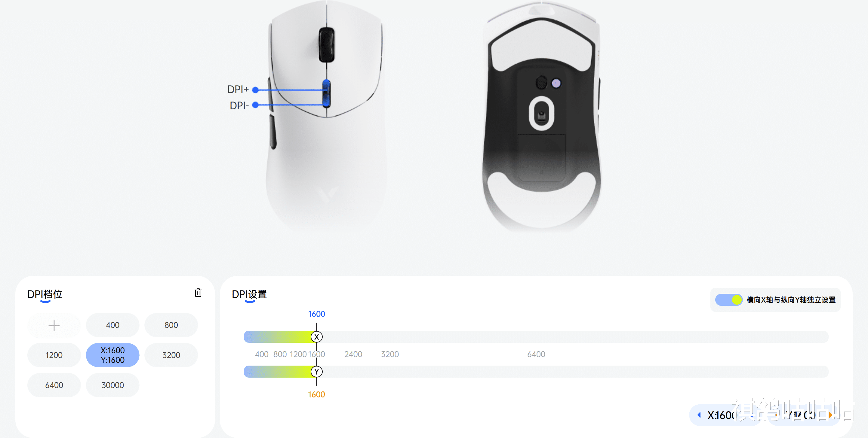 详细设置里DPI设置是第一个,7个档位可以设置,也可以自行删除,删除之后也可以再添加,调节方式就是拖动“进度条”,数值会变化,VT7会以50为单位变化,VT7 MAX则会以10为单位变化,精度会更高。而右侧一如既往的有横向和纵向的独立调节,调节方式也和统一调节一样,非常直观。