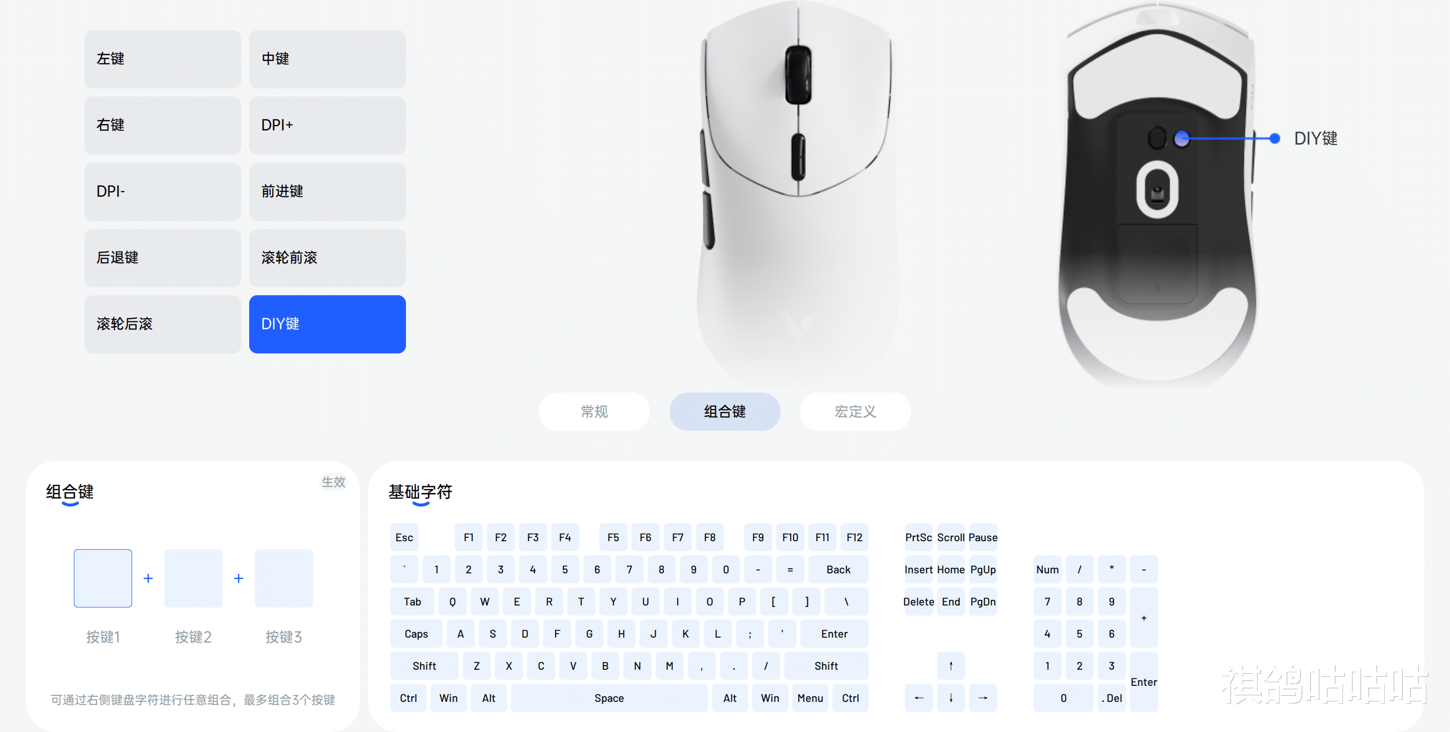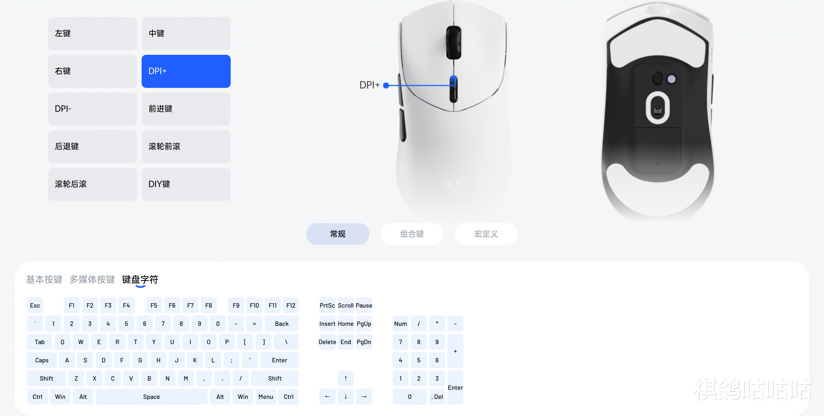 第二个界面是改键,改键的内容也很多,8个按键可以选择,每个按键都可以按照常规、组合键、宏定义进行设置,比如常规就是一键实现一些上一首、下一首、增加音量、减少音量等功能,组合键的话可以最多实现3个按键组合,自行定义,宏的话就是自己去录制和设置了,这个玩得不多。