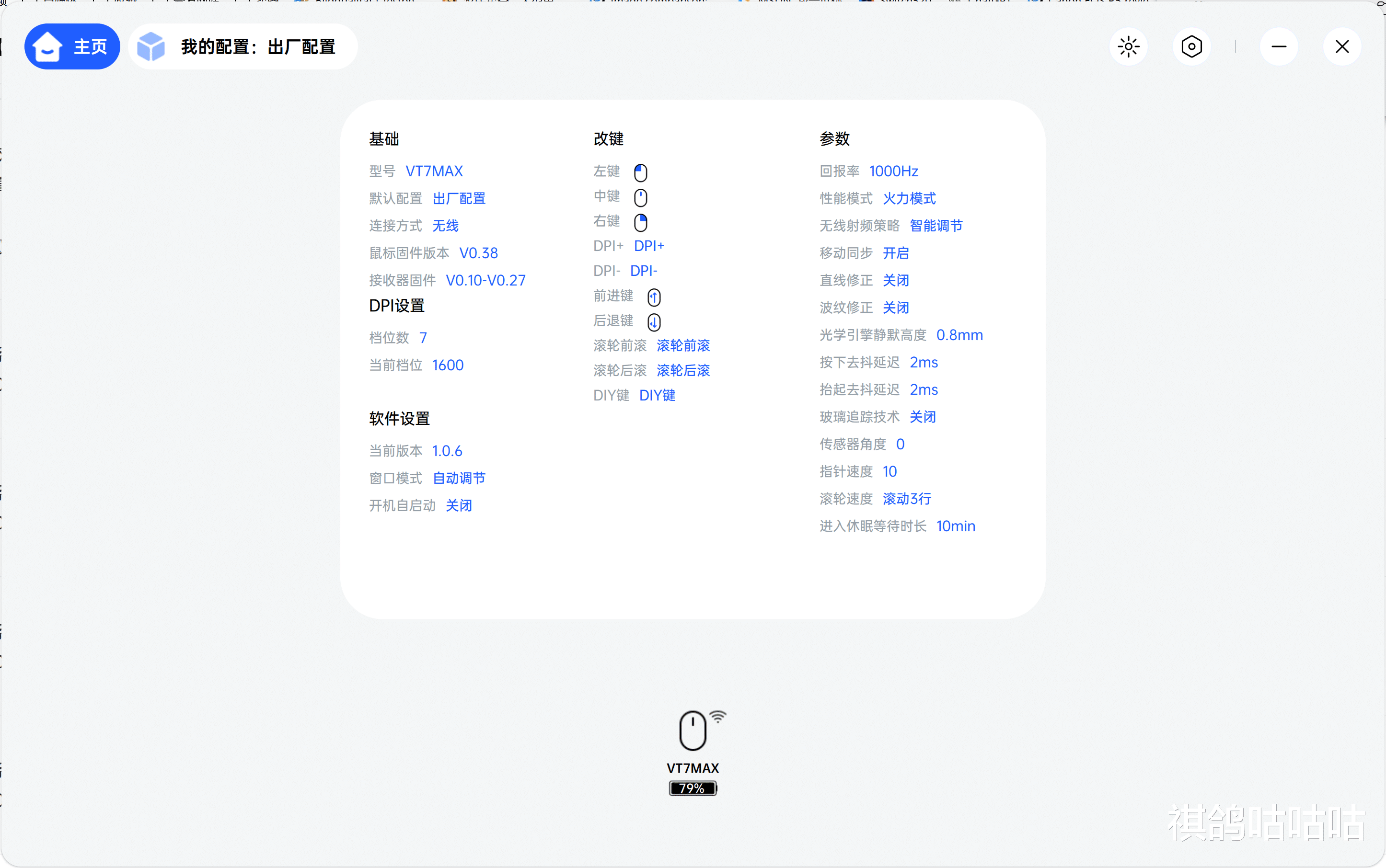 左上角可以选择配置,这部分就自行DIY了,办公模式、游戏模式、竞技模式等等,自行定义。中间是鼠标VT7 MAX的一些概况,比如有版本更新,设备概况、目前的连接方式和电池电量。