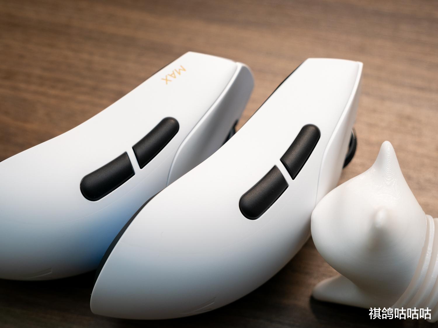 之前说两者放一起,基本没什么区别,所以最大的区别就是MAX会在鼠标左侧前端印上金色的MAX作为区分,其他一模一样。而且从侧面看顶部的隆起非常明显,毕竟为大手设计,可以满足抓握、趴握、指握。两侧也有特调的弧度设计,握持感更好。
