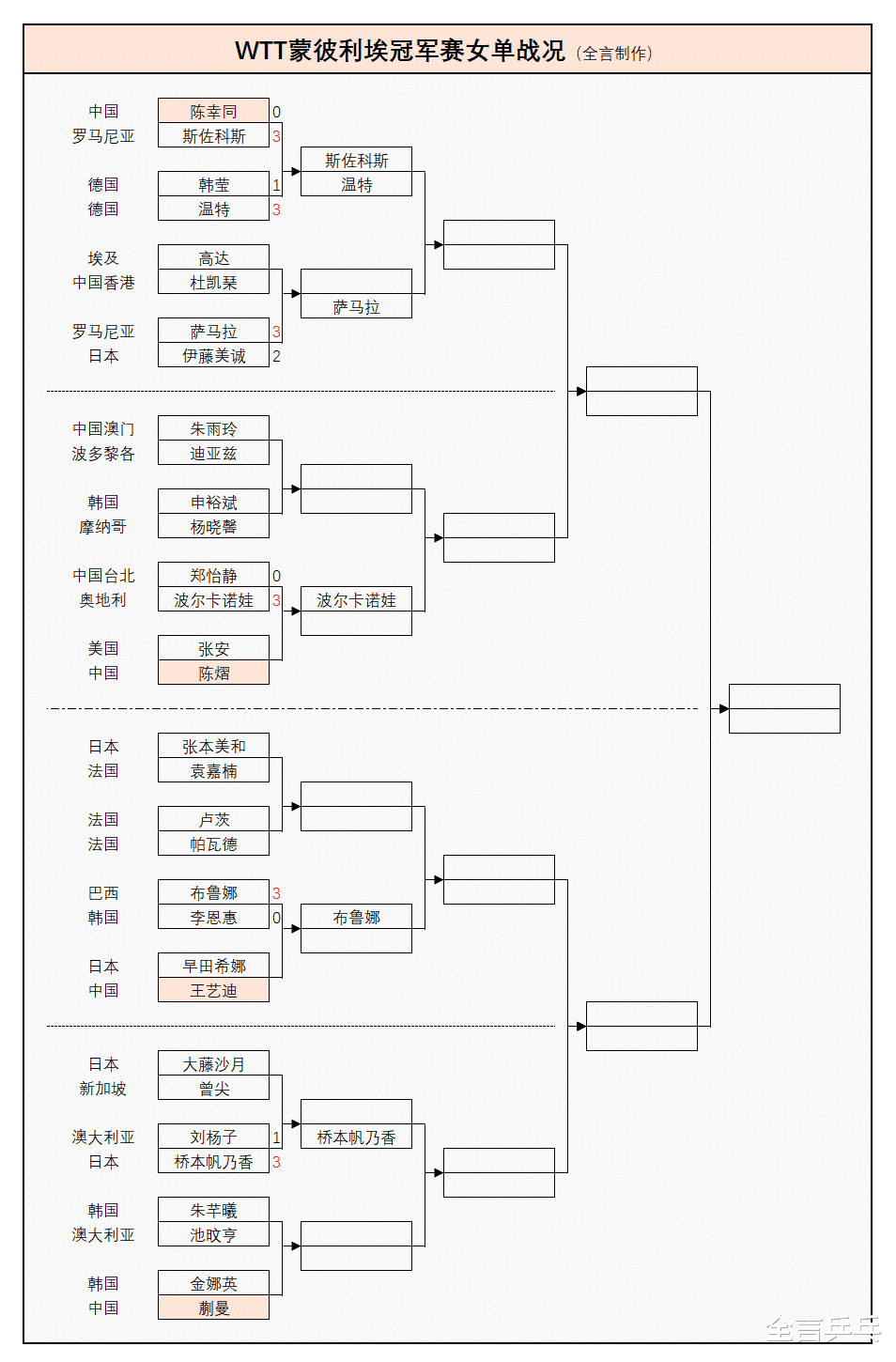 日本奥运冠军伊藤美诚的出局无疑最意外,尤其后两局都是多次领先后被翻盘;德国奥运亚军韩莹不敌队友温特不算冷门,中国台北世界亚军郑怡静一局未赢不敌波尔卡诺娃令许多人没想到,布鲁娜淘汰李恩惠也符合二人近期的发展势头。
