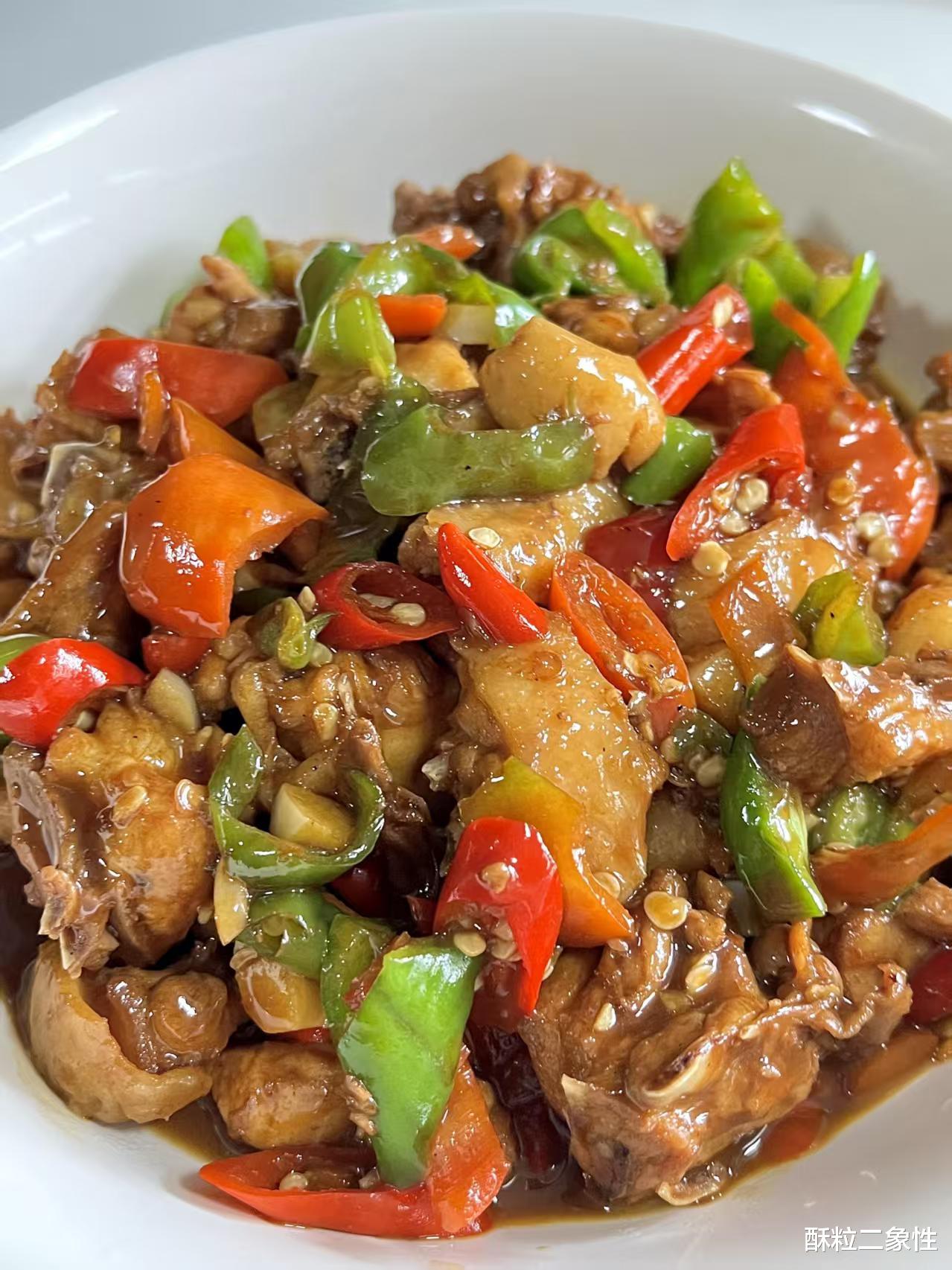 时间一到,掀盖!汤汁收得差不多,鸡皮亮出琥珀光。此时倒入青红辣椒+一把蒜蓉,大火快炒,辣椒的清爽+蒜的冲劲同时爆炸,蚝油最后淋下去,酱汁立刻变绸缎,牢牢裹住鸡块。辣、酸、鲜、香层层叠,筷子一戳,肉脱骨而出,汤汁顺着指缝滴在米饭上,一粒米都不肯放过。