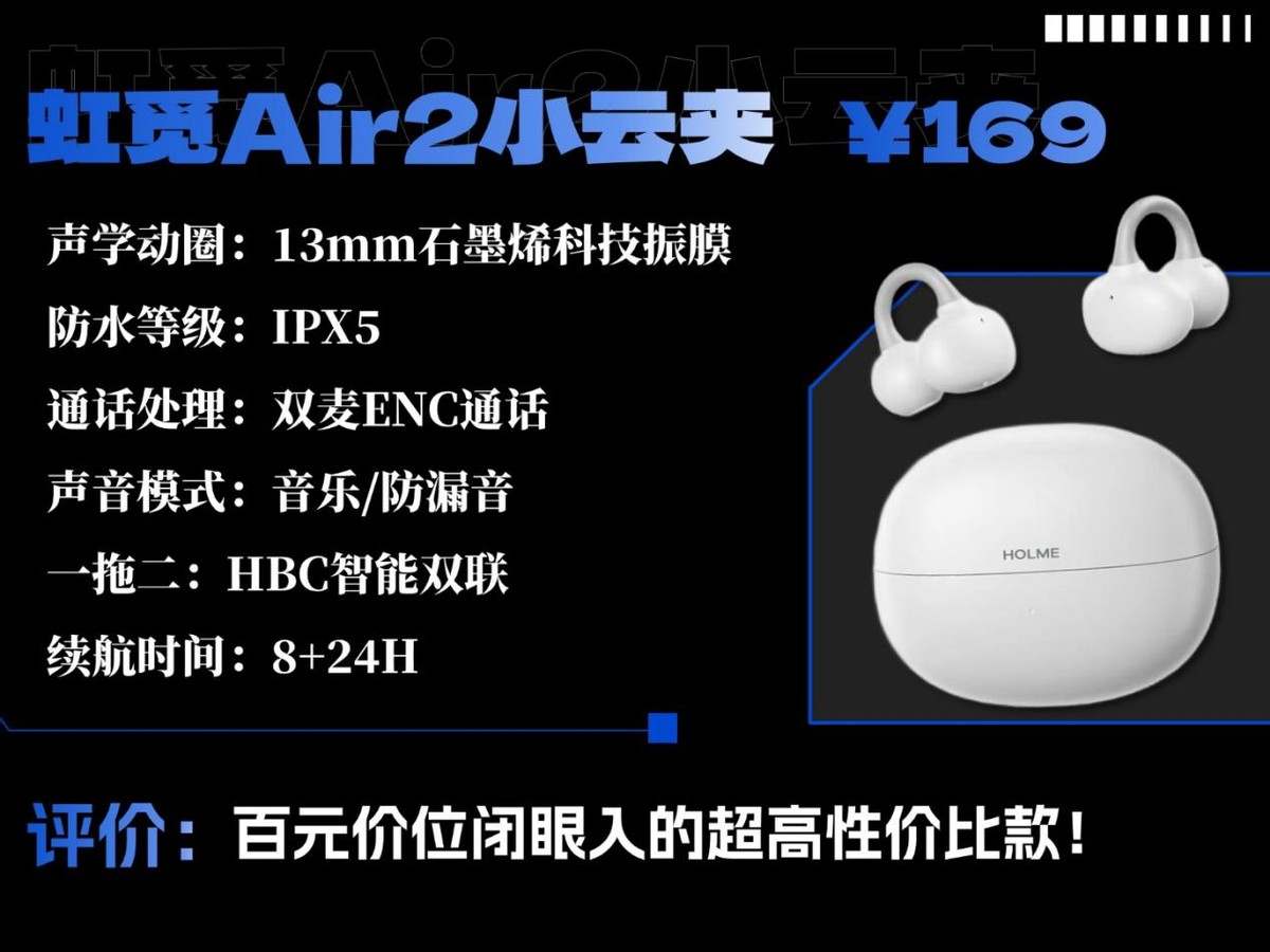 虹觅HOLME Air2小云夹价格:169 元推荐理由:百元价位闭眼入的超高性价比款!