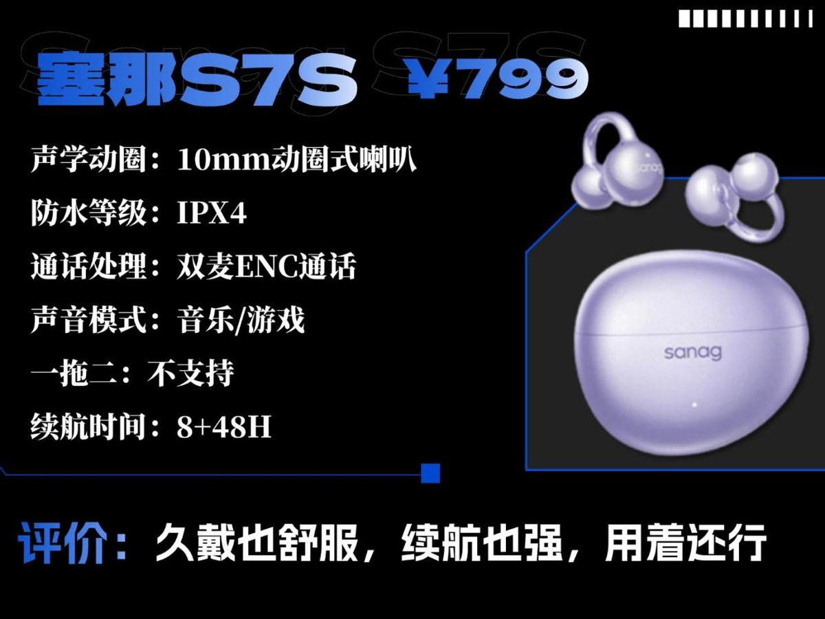 塞那S7S这款最打动我的点就是它戴着很轻,单只才 4.2g,是本期最轻的一款,戴着真的可以说是无感,而且耳夹的角度设计得很合理,稳定性也不错。