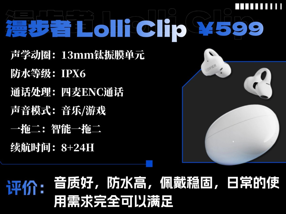 漫步者 Lolli Clip价格:599元推荐理由:音质好,防水高,佩戴稳固,日常的使用需求完全可以满足