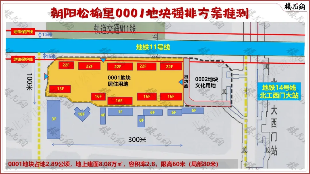 花姐做了一版强排推测方案,预计整个小区只有两排房子,南面第一排为13-16F,第二排为22F;主大门设在东面的街坊路上,车库出入口东面和西北各一个。
