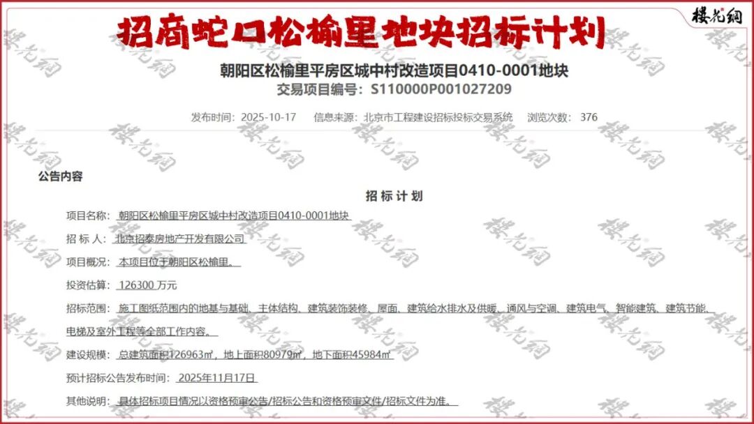 早在10月17日,招商蛇口就发出了有关0410-0001地块的招标计划,涉及施工、监理。这天,刚好是0001地块进入预申请的日子。