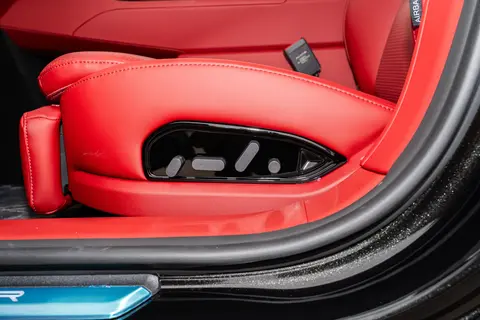 车尾的电动升降式扰流板是个亮点,低速的时候收起来,看着很简洁;高速的时候自动打开调整角度,既能让车更稳,又增加了运动感。扁平的尾灯组横向穿过车尾,晚上点亮的时候特别亮,辨识度很高。再加上立体感十足的下包围,整个车尾看起来简洁又有力量。