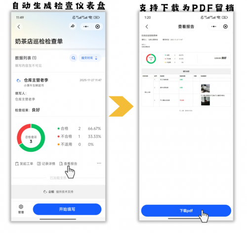 巡店督导填写完检查单后,企鲸会自动生成对应的门店检查报告,关注企鲸公众号的管理层会实时收到填写完成通知,每家门店的检查详情管理层可随时查看,还可以一键导出为pdf形式留档。