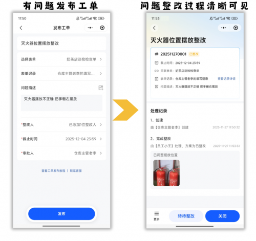 检查整改闭环处理,发现不合格问题,管理人员可立即提起【工单】要求门店负责人整改。