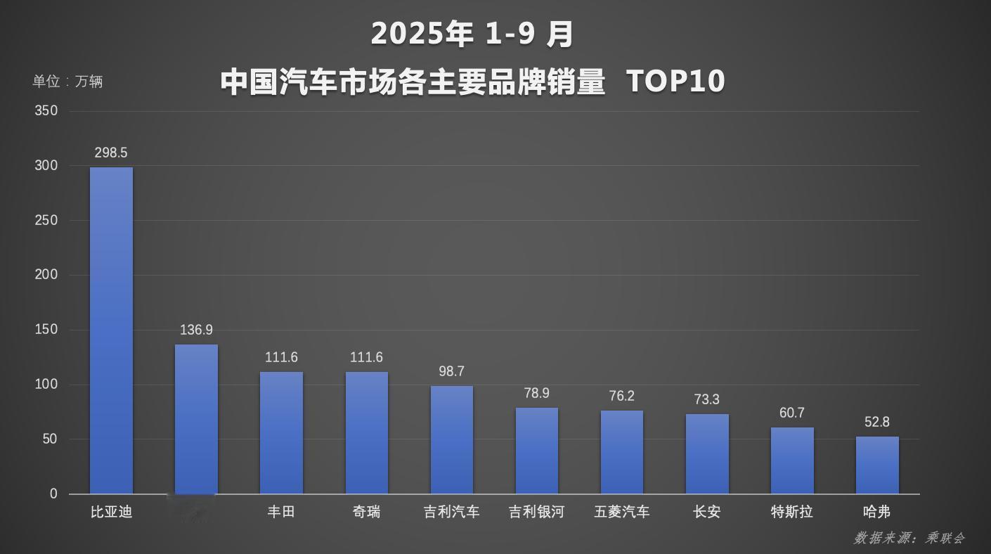 细分品牌来看,比亚迪汽车(王朝丨海洋)表现尤为抢眼,9月单月销量35.6万辆,1-9月累计销量298.5万辆,在全市场单一品牌销量排名中稳居冠军,且领先优势远超其他品牌,持续巩固头部地位;即便是在智能化细分赛道,比亚迪同样展现统治力——在太平洋汽车发布的9月智能驾驶辅助车型品牌销量榜中,比亚迪销量是第二名的4倍还多,以断层优势荣登榜首,将友商远远甩在身后。