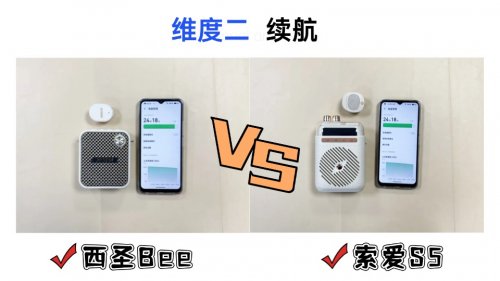 相比之下,索爱S5的表现也不错,尤其是在教室里,人声够清楚、够响亮。它的78mm大单元和全指向麦克风让声音覆盖范围不错,即便站在教室后排也能听到讲课内容。不过如果环境稍微复杂一点,比如教室外操场上,声音的细节和层次感就不那么丰富,高音稍微平了一点,但整体还是稳定好用,日常教学完全够用。维度2.续航为了直观测试无线扩音器的续航表现,我设计了一项实验:连续让西圣Bee和索爱S5进行全天候讲解模拟,通过观察两款设备在长时间使用后的电量消耗情况来评估它们是否能支撑整天工作需求。电量消耗越平稳、持续时间越长,就说明这款扩音器在日常使用中更加可靠和省心。